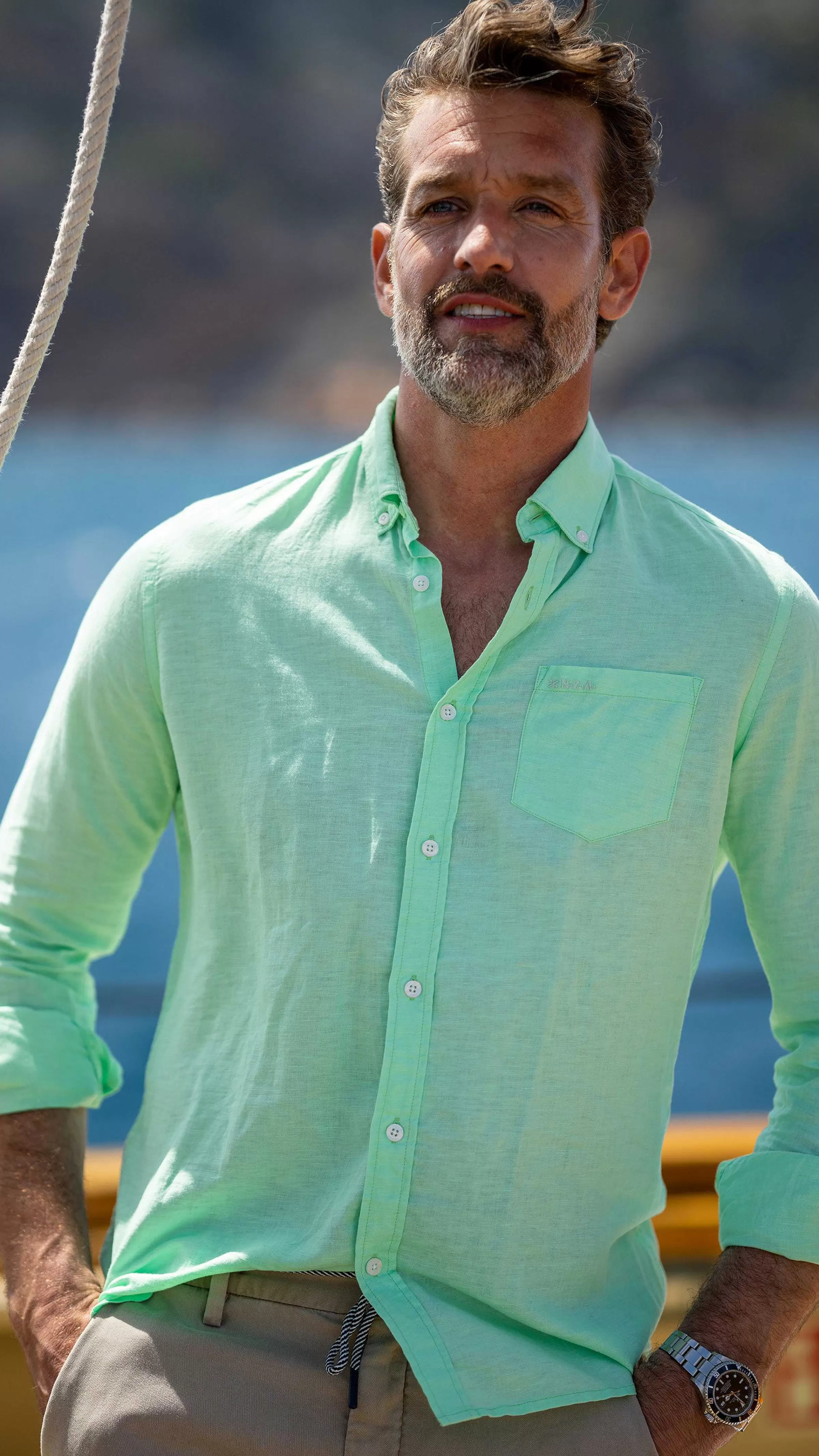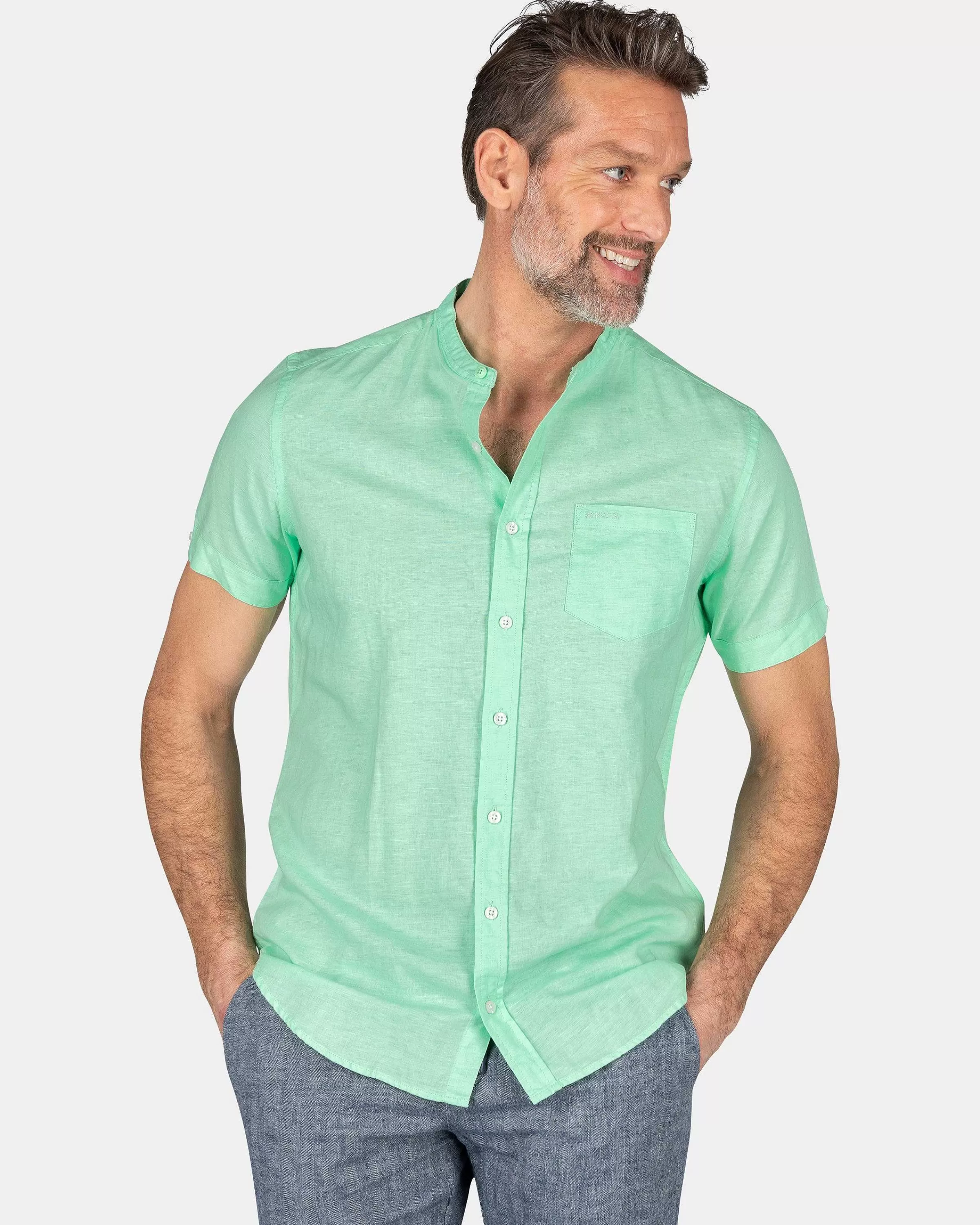 Effen Overhemd Korte Mouw – Teal GreenDe Okarito Lijkt Een Basic Herenoverhemd Met Korte Mouwen. We Zouden Het Echter Niet Aan De Nza New Zealand Auckland Zomercollectie Kunnen Toevoegen Als We Niet Dat Tikkeltje Extra Pit Hadden Gegeven. Een Subtiel Accent Gekleurd Logo Op De Borstzak, Accentkleurige Details In De Halslijn En Een Comfortabele Linnen/Katoen Melange. We Durven Te Wedden Dat Je Dit Overhemd Elke Dag Wilt Dragen Dit Seizoen!Verkrijgbaar In Traditional Navy, Shimmering Sand, Dusk Navy, Rhythm Blue, Bed Blue, Mellow Army, Fury Pink, Chalk Green, Teal Green, White En Iguana Yellow